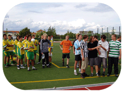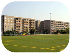 Ende 2001 nach Entwürfen des Plan- ungsbüros Brinkmann-Deppen-Lehmacher zu einer neuen multifunktionalen Sport- und Freizeitanlage umgebaut. Mittelpunkt bildet ein Fußball-Kunstrasenplatz, umgeben von einer Laufbahn. Ergänzt wird das Angebot durch verschiedene weitere Ballspielfelder und Leichtathletik- anlagen. Der Sportplatz wurde im Mai 2002 den Nutzern übergeben. Der Sozialtrakt wurde im Dezember 2002 fertiggestellt. Die Finanzierung der Kosten in Höhe von 1,1 Mio. Euro erfolgte aus dem Bund-Länder-Programm "Soziale Stadt". |